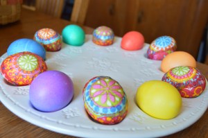 Decorating Easter eggs, one of my favorite traditions. This year I tried “egg-white decopage,” with thanks to instructions from La Receta de la Felicidad blog. This is one of those things that looks crafty or artsy but is ridiculously simple. All you need are egg whites (in lieu of decopage glue), paper napkins with a pretty pattern, and a small paint brush. Voila. Fun and easy. The solid-color eggs were dyed with the good ol’ Paas kit. Honestly, I think the decopage eggs were easier and faster, especially considering the following.
